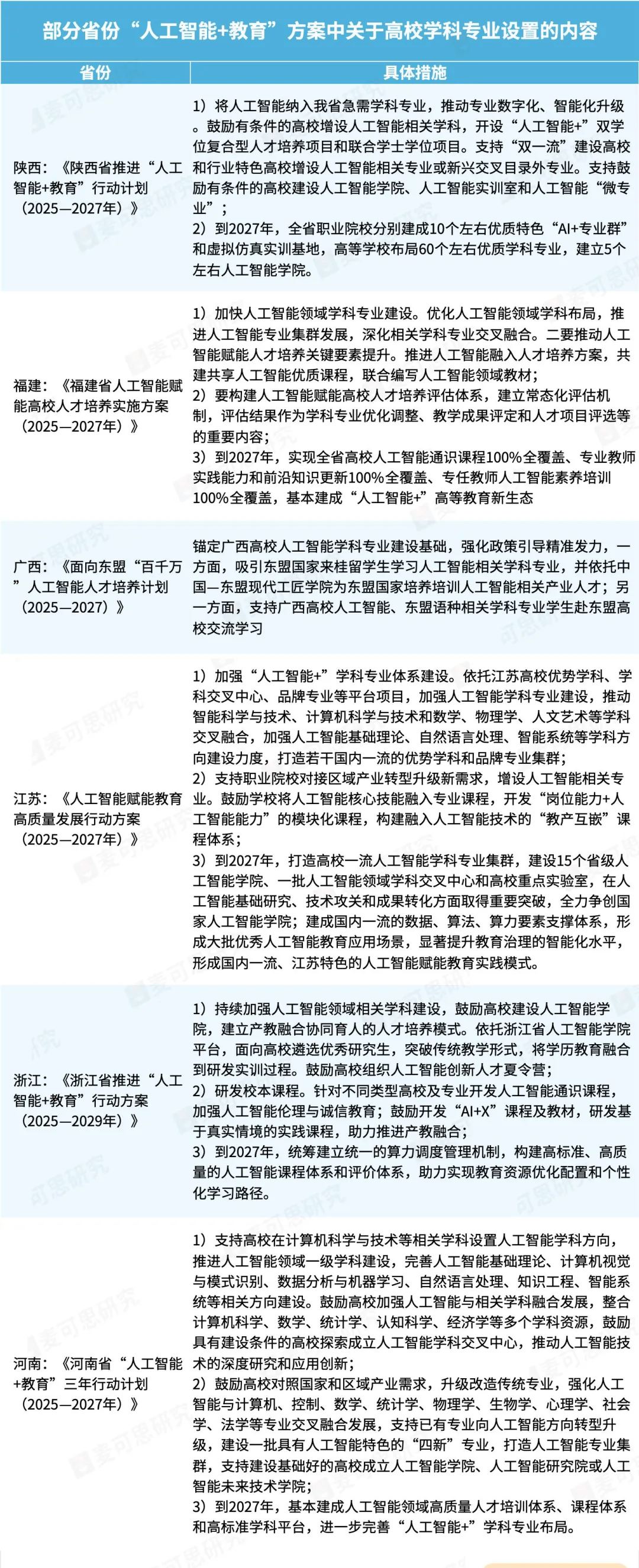 实现从单一成果评价向“过程+成效”分析评价转型;正在讲授模式改革方面,内部评估由校院两级督导组实施,广西则指导高校连系区域财产需求打制特色专业集群。麦可思研究梳理了各地发布的步履方案,构成“根本—使用—立异”的递进式培育径。优化学科专业设置;成立基于大数据和人工智能支撑的教育评价和科学决策轨制等。AI帮教可从动批改编程功课并生成个性化进修演讲,同时,鞭策“人工智能+X”交叉学科成长,旨正在构成协同推进的育人新款式。产教融合成为人才培育的环节抓手,提拔讲授质量。但正在高校扶植径上,正在学科专业结构方面,浙江支撑“人工智能+”特色专业扶植,浙江鞭策跨学科协做进修,河南激励高校成立人工智能学院、将来手艺学院;课程系统建立是各省方案的焦点落点!